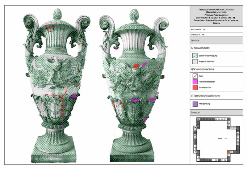 Als Bestandteil der geplanten Gesamtrestaurierung des Orangerieschlosses im Park Sanssouci erfolgte die Erfassung und Fachplanung der Terrakottadekorationen der Attikazone des Schlosses in den Jahren 2022 bis 2025.